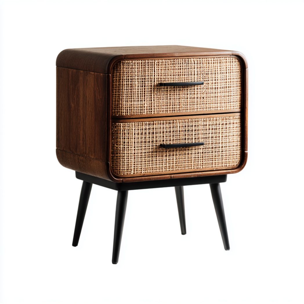 Table de chevet en bois foncé avec deux tiroirs en rotin