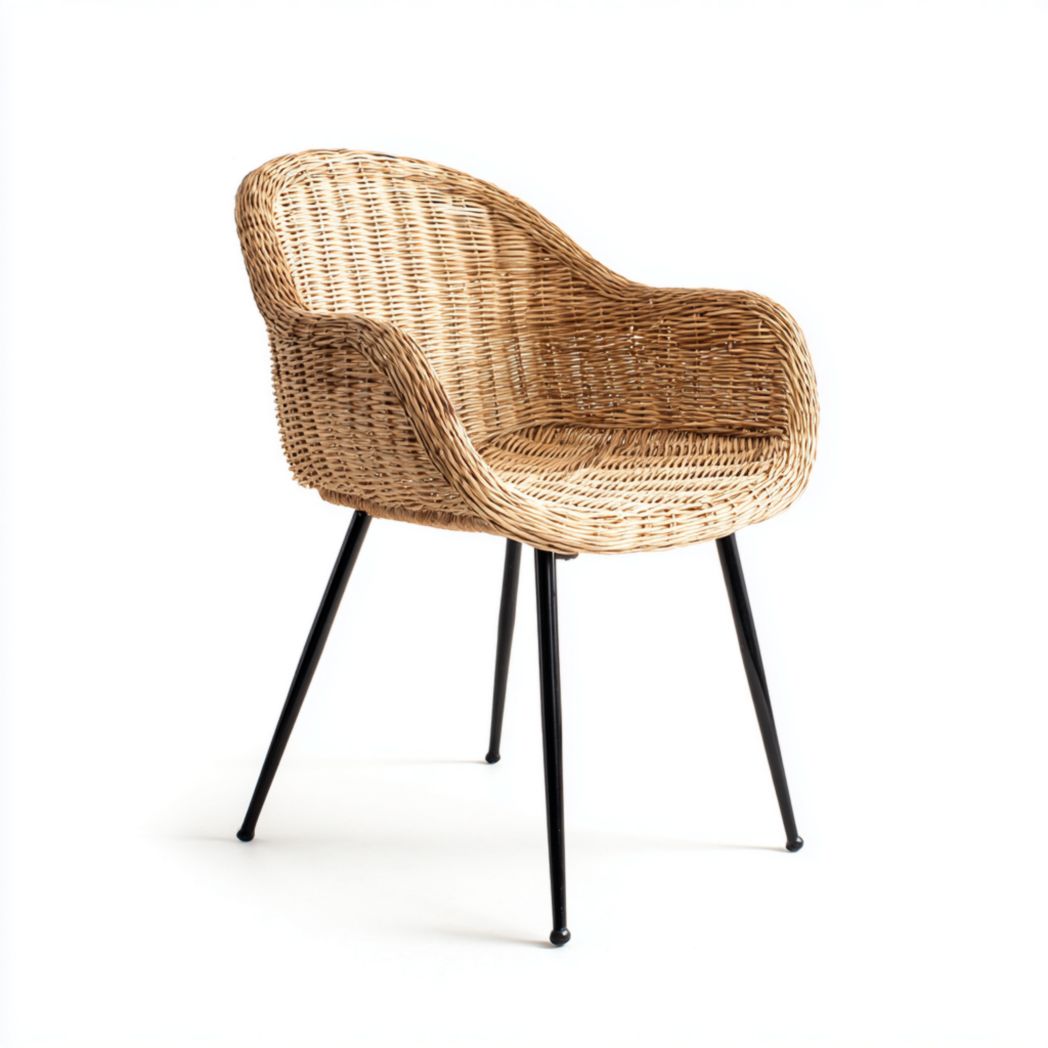 Chaise de jardin en rotin synthétique avec accoudoirs et pieds en métal noir