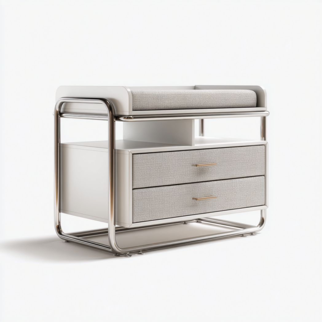 Table à langer moderne avec structure métallique et tiroirs en tissu gris